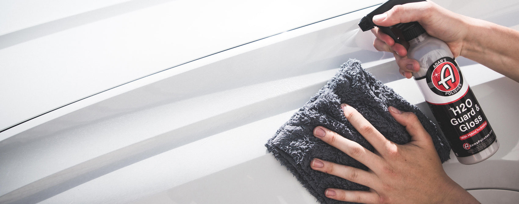 Enter Adam’s H2O Guard & Gloss with Hybrid Technology, a formula that’s even easier to apply with increasingly better results. When we went to the drawing board for developing this product, we wanted to combine hybrid chemistry with a hybrid application, so in doing so, we pumped silica resins, optical grade polymer resins, and carnauba emulsifiers into one chemical. This product not only can be used as the crowd favorite with one wet Borderless Grey towel and one dry to buff away streaks but since it’s less streaky you can spray and wipe DRY!