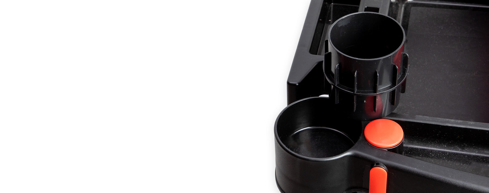 Keep your detail supplies organized with our Standard Detail Cart. Made with durable polyamide plastic shelves and lightweight aluminum legs. Each shelf has two dividers that can be removed if desired, two cup holders, and cord wraps so you can keep your polisher cords or other power tools tidy.