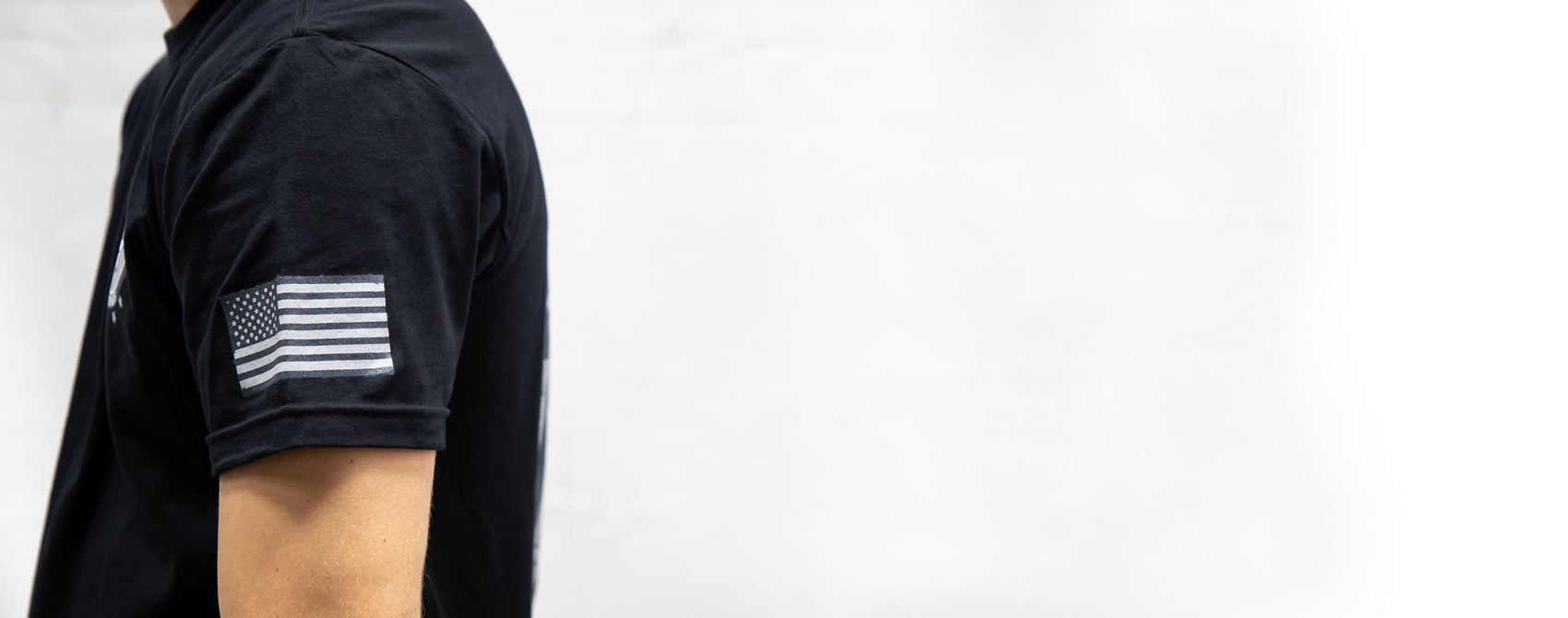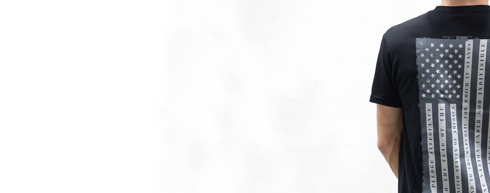 American Pride Shirt includes a fully printed flag on the back with the pledge of allegiance.