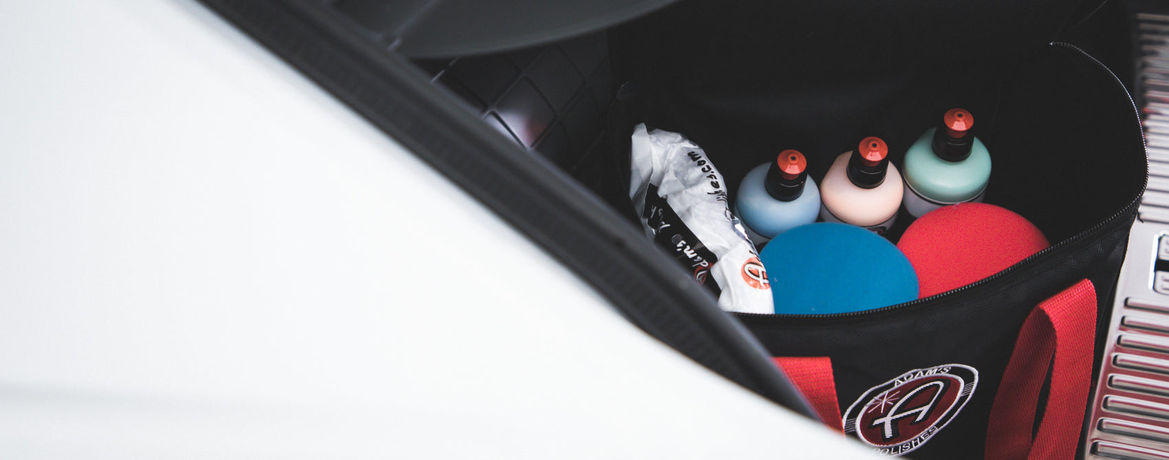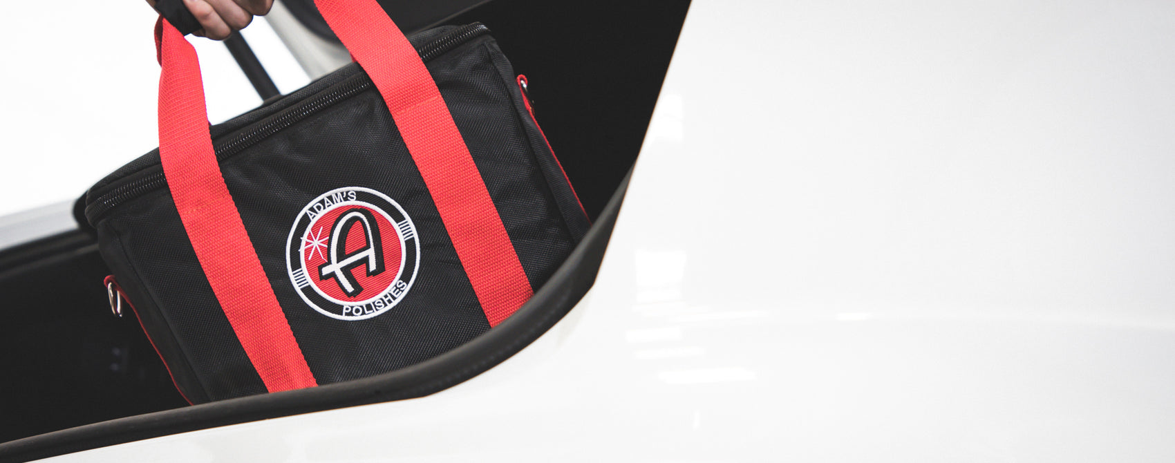 For years we have been selling detailing bags here at Adam's. This, by far, surpasses them all. This bag is made with heavy duty water resistant nylon, stainless steel hardware, red straps and a large 5" embroidered Adam's Logo. The bag also has 8 bottle straps inside to hold our 16oz bottles.