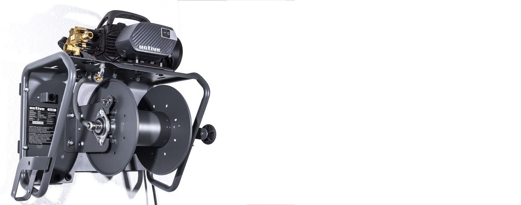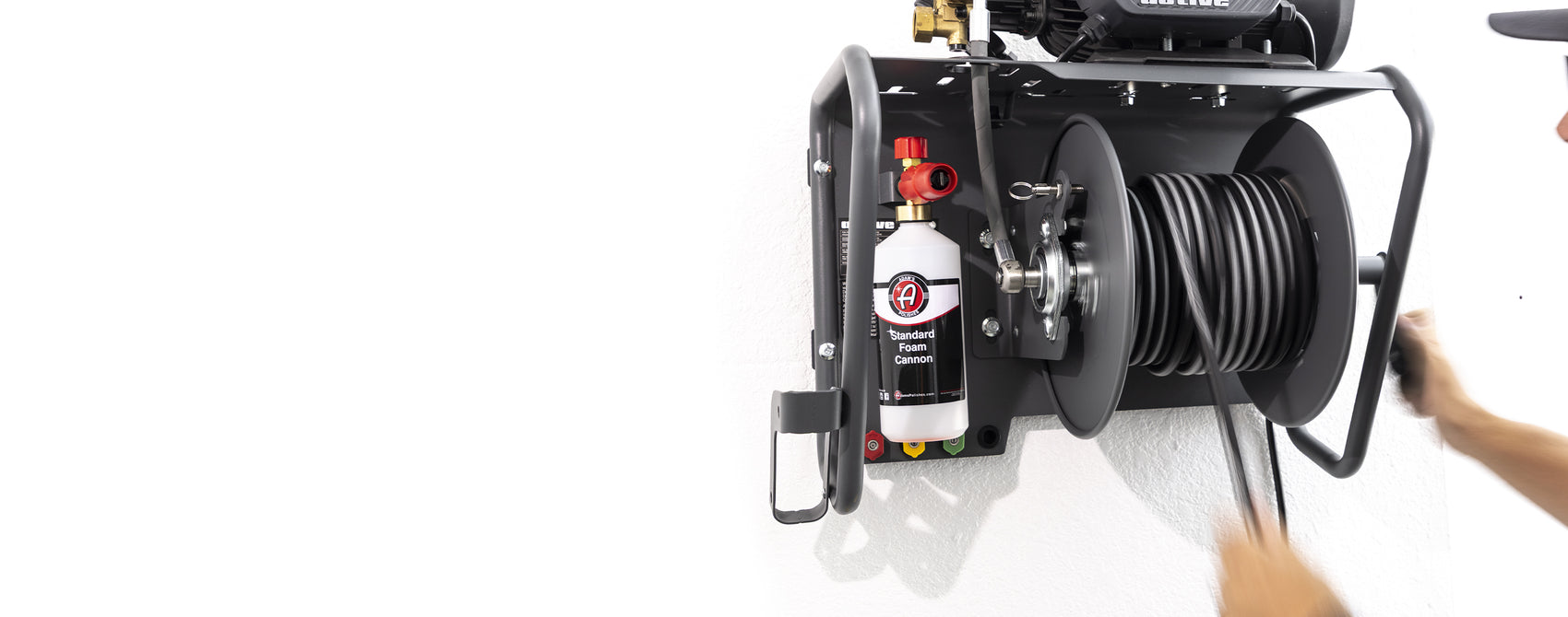 Adam's Active Hose Reel Wall Mount System is compatible with truly any pressure washer up to 88 lbs. This wall mountable system allows you to get your pressure washer setup off the floor, out of the cabinet and onto the wall. Store your pressure washer, pressure washer hose, foam cannon, snub nose, extension wand and more all on one simple mountable solution. All fittings will be accessible with all Active Products, plus we threw in an additional adapter in case you want to upgrade your hose and use our Steel Braided Super Flex Pressure Washer Hose.