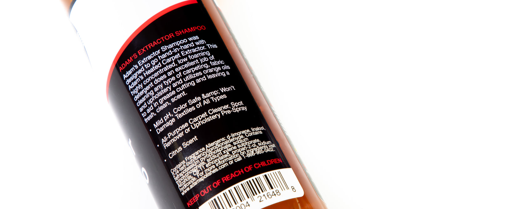 Adam’s Extractor Shampoo was designed to go hand-in-hand with Adam’s Heated Carpet Extractor. This highly concentrated, low foaming detergent does an excellent job of cleaning any type of carpeting, fabric and upholstery and utilizes orange oils to aid in grease cutting and leaving a fresh, clean, citrus scent.
