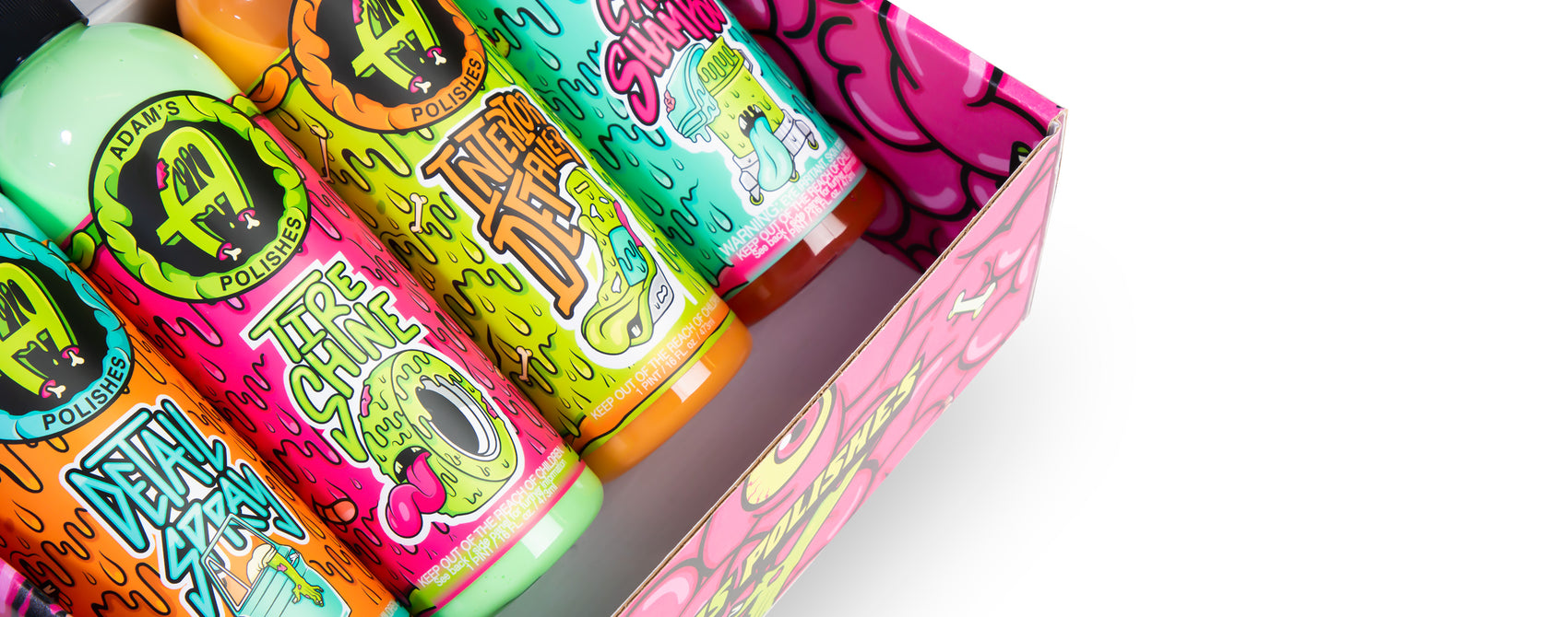 Adam's Detail Spray usually has a costume change for Halloween, but this year we decided to add other car care products like Car Shampoo, Tire Shine, and Interior Detailer. Each bottle has a car related part or detailing product on it, but with a twist. Don't miss out on these one of a kind designs!