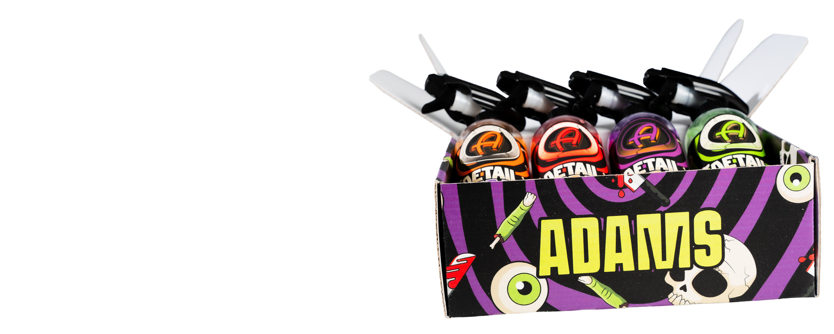 Adam's Halloween Box Kit features 4 of our best selling chemical, Detail Spray. Each bottle has car related parts or Halloween products on it. Eyeballs, Turbos, Potion and more in 4 different colors and scents that you will love. Don't miss out on these one of a kind designs, scents and colors!