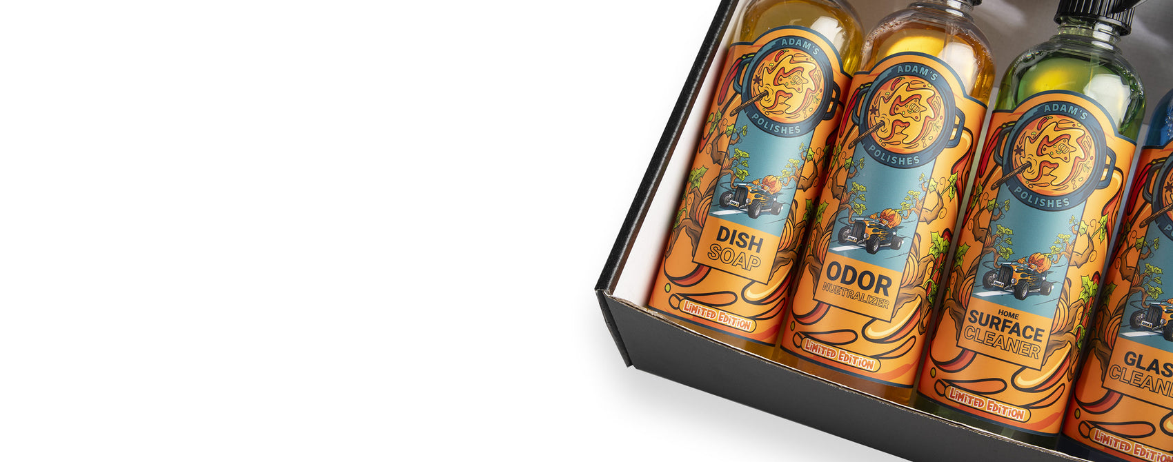 Embrace the spirit of autumn while keeping your house clean with our annual Pumpkin Spice Collection. This Pumpkin Spice Home Care Box Kit makes an excellent gift choice. It's a thoughtful and functional present that adds a touch of seasonal cheer to everyones house. This years design features a fiery pumpkin at the wheel of a hot rod, racing through a backdrop of fall vibes and spicy-scented clouds.