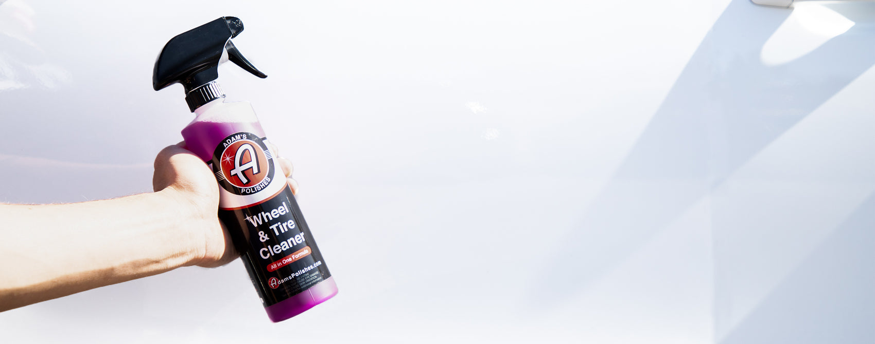 Spray the tire sidewall and wheel surfaces liberally with Adam’s All in One Wheel & Tire Cleaner.
