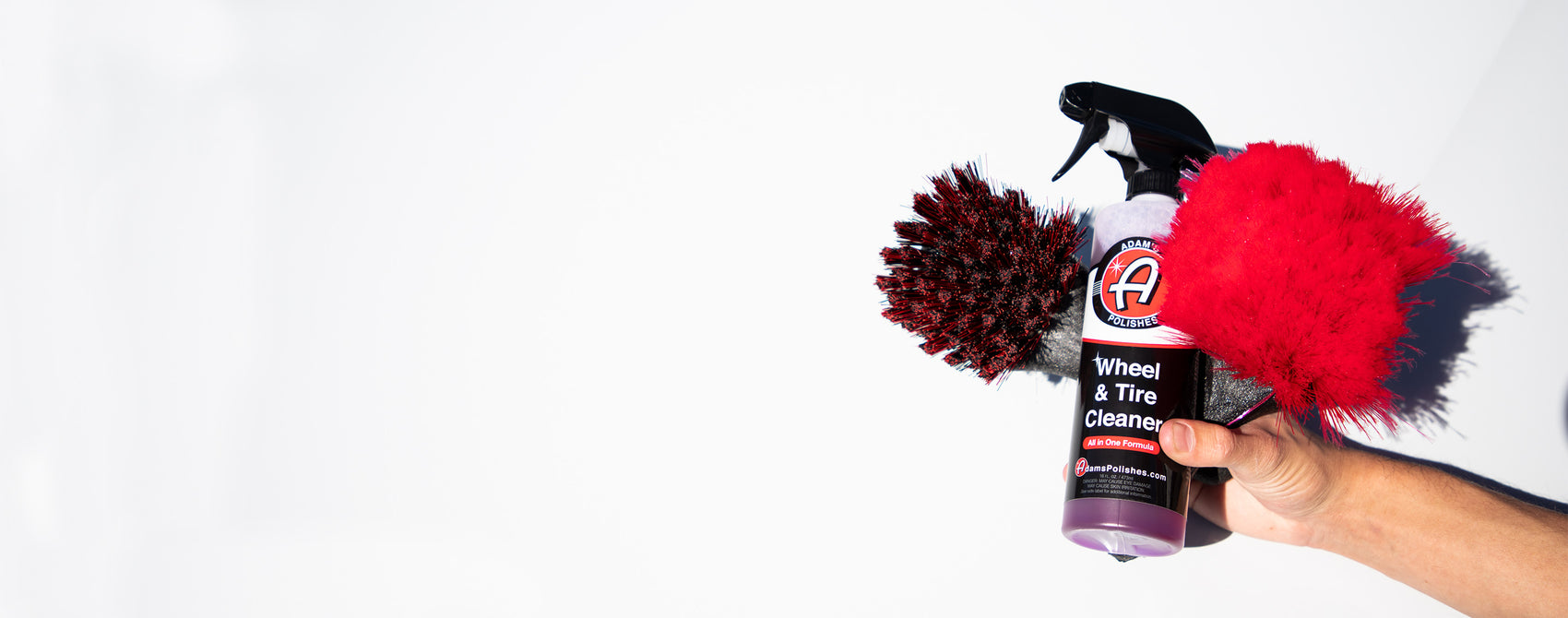 Scrub the tire sidewall with Adam’s Tire Brush and Wheel Surfaces with Adam’s Wheel Brush and Barrel Brush. Do not allow product to dry onto any surface of the wheel.