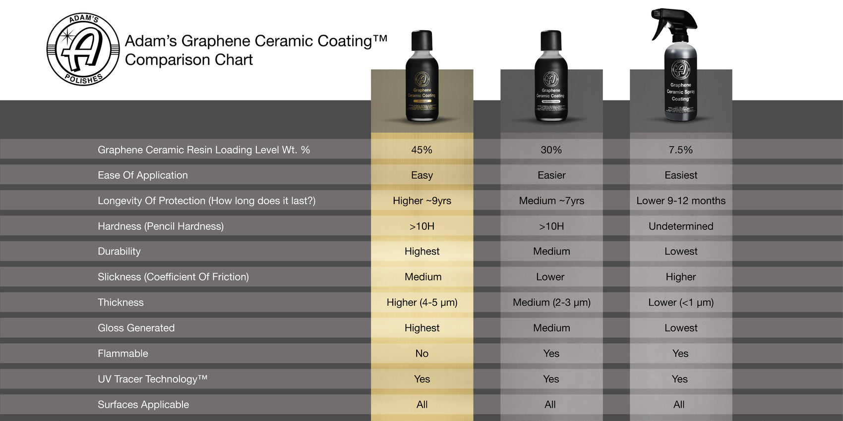 With the inclusion of Graphene, Adam’s UV Ceramic Coating has evolved! Our Graphene Ceramic Coating™ has been verified to have >10H Hardness. Compared to the original Ceramic Coating, the Graphene variant will be found to have some improved characteristics: